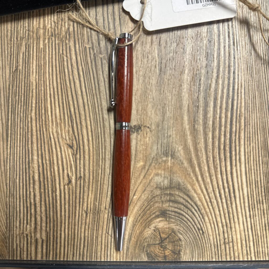 metal parts from penn state industries, wood scraps turned on a lathe and put together to create a pen.